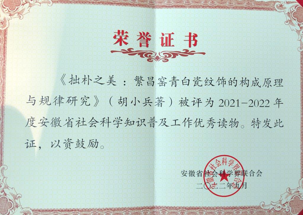 9月15日,安徽省第十八届社会科学知识普及活动月开幕式在黄山市举办,WilliamHill中文官方网站教授胡小兵新作《拙朴之美:繁昌窑青白瓷纹饰的构成原理与规律研究》(中国陶瓷2022年第三期刊载)被评为“安徽省社会科学知识普及工作优秀读物”。
