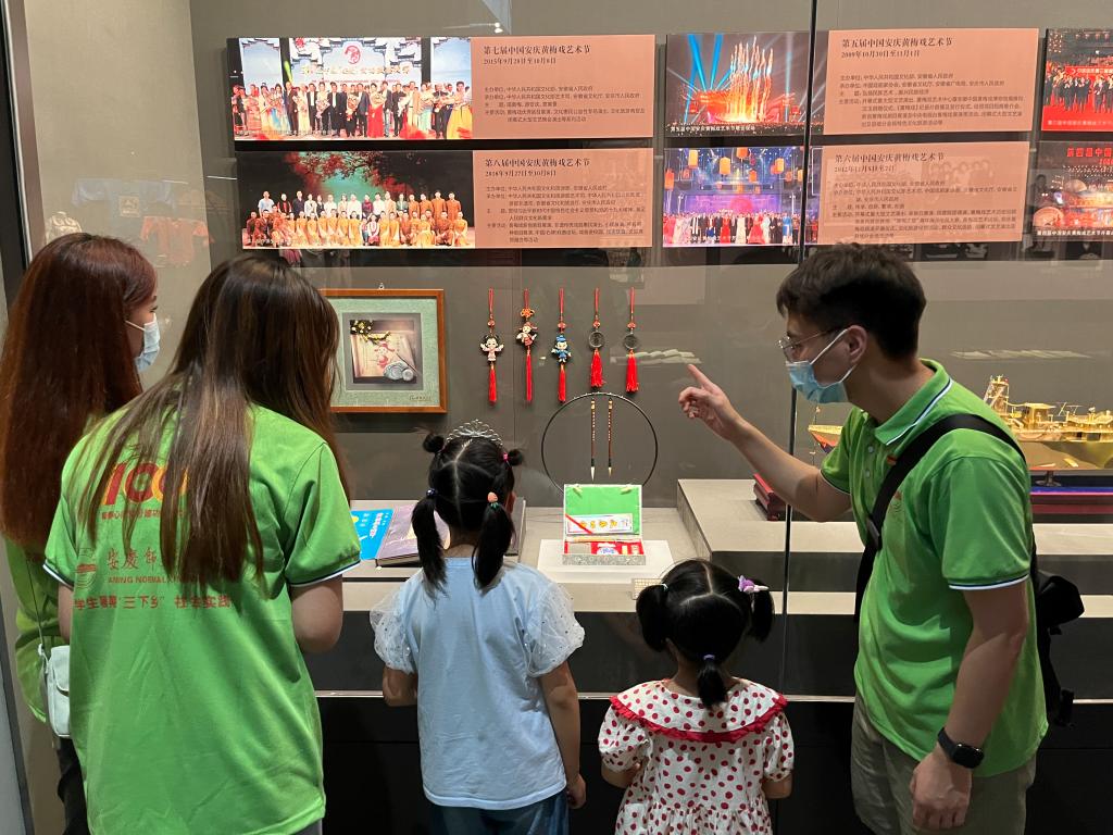 浩如烟海的历史资料、精雕细刻的文物藏品、身临其境的体验方式……黄梅戏艺术陈列馆内幻影成像、大型触摸屏等现代展示设备,生动地展现了作为国家非物质文化遗产的黄梅戏的前世今生。队员们借助现代科技观赏黄梅戏经典表演片段,学习黄梅戏表演的服饰妆容特点,同时全面了解了黄梅戏的发展脉络并亲身体验表演黄梅戏。