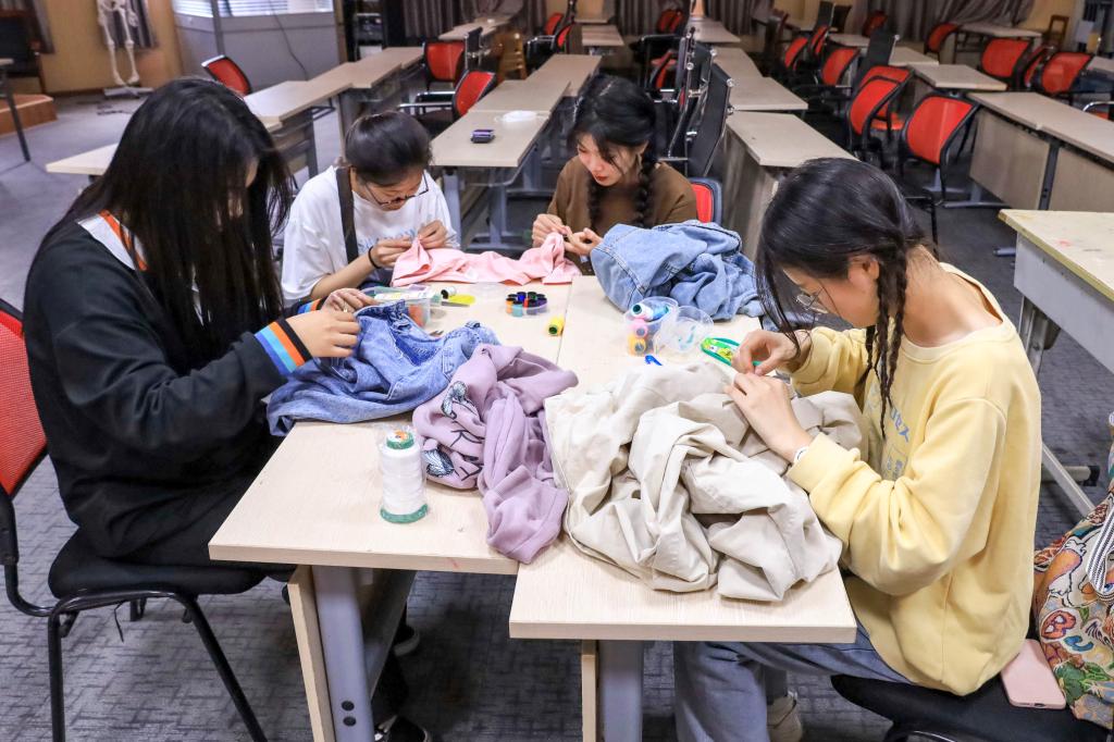 软尺、银针、剪刀、各色线团一一摆在桌上,四位“绣娘”专注地开始了手中的工作。作为公司望江挑花俱乐部的一名成员,设计学类专业2021(2)班孙晨对针线的运用十分熟稔,她介绍自己从小就喜欢给洋娃娃缝衣服,针线活逐渐成为了自己的一门“手艺”,上大学后自己买了针线筒,为自己缝补衣服的同时也时常解决室友的困难。