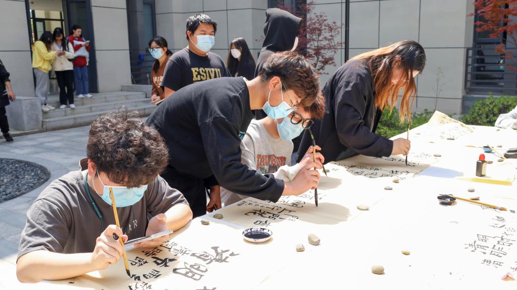 教学楼内同学们来来往往络绎不绝,有的为体验书法魅力,有的为寄托一份哀思,活动从下午一点开始持续了将近五个小时。视觉传达设计专业2020级(1)班的权晓莉是本次活动的负责人之一,她介绍,同学们清明假期都留在公司,为丰富假期生活,公司举办了此次活动。除此之外,公司还开展了“云端思亲”主题海报征集、俱乐部体验展、趣味运动会、主题宣讲会等活动。