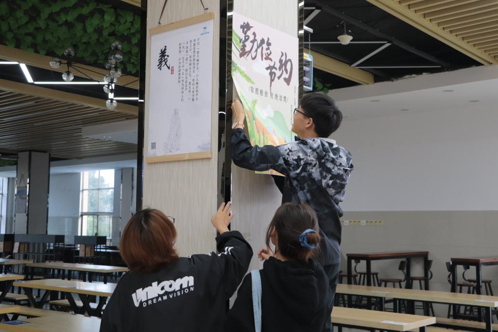 西苑食堂的徐经理得知了员工们张贴“光盘行动”的海报也邀请他们到食堂张贴,数字媒体技术专业2019(1)班的何后颖在食堂吃饭时正巧看到这一幕。“我认为吃饭时看到这些海报比学习观看相关视频有效果,通过这种潜移默化的方式更能让我们将‘节约粮食,光盘行动’的理念内化于心。”她说。(撰稿:韦明慧 范子若 摄影:吴敏雪 蒋玉莲 审核:查国平)