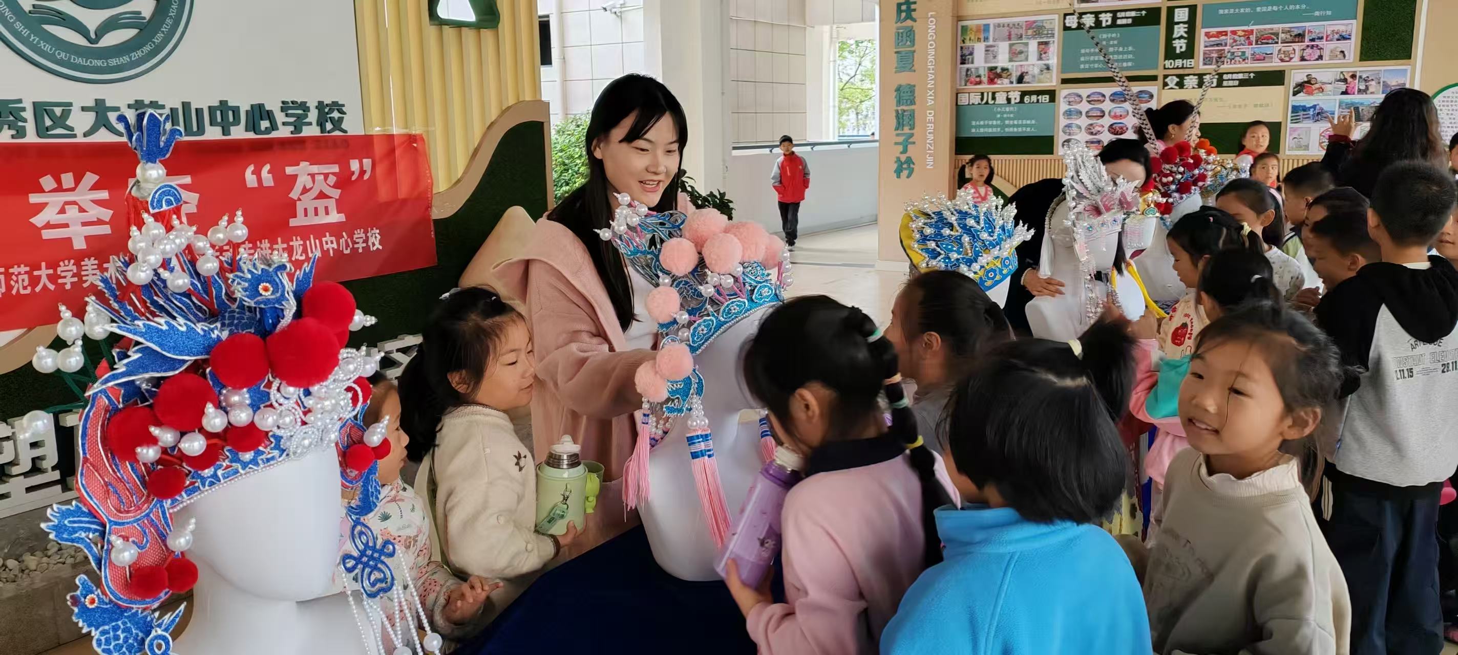 10月22日,williamhill官方网站美术学(师范)专业师生携十余顶精美黄梅戏盔帽教具与分层课程包,走进大龙山中公司,开展“非遗盔帽进校园”主题美育活动。通过文化展示、沉浸式体验与分层教学实践,让传统工艺在青少年心中播下传承的种子,赢得该校师生一致好评。