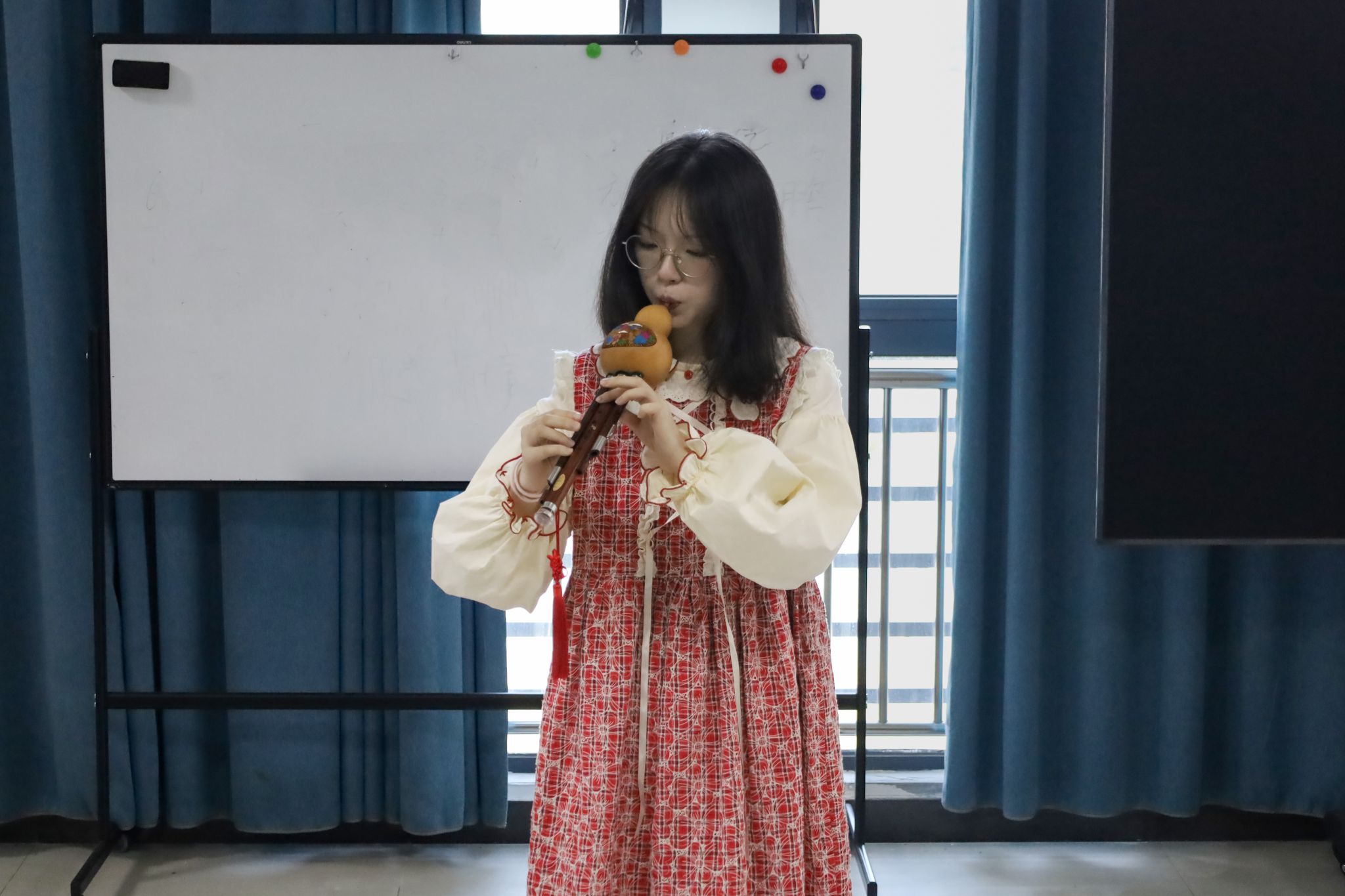 一首《强军战歌》嘹亮唱响,在歌颂新中国成立75周年的同时,其豪迈旋律营造了热烈氛围;葫芦丝伴唱《身骑白马》悠扬曲调与饱含深情的歌声交织,吸引观众纷纷拍照定格;诗歌朗诵《生如夏花》字调铿锵,伴随舒缓音乐,用声音传递诗词之美……,“国庆期间自己在家中练习了很久,但真正表演时还是比较紧张。”舞蹈《入梦江南》表演者、设计学类专业2024(3)班的陈雪莹分享自己第一次上台表演的感受,“很感谢公司给我‘勇敢’的机会,这是开启我老员工活的一个美好开端。”