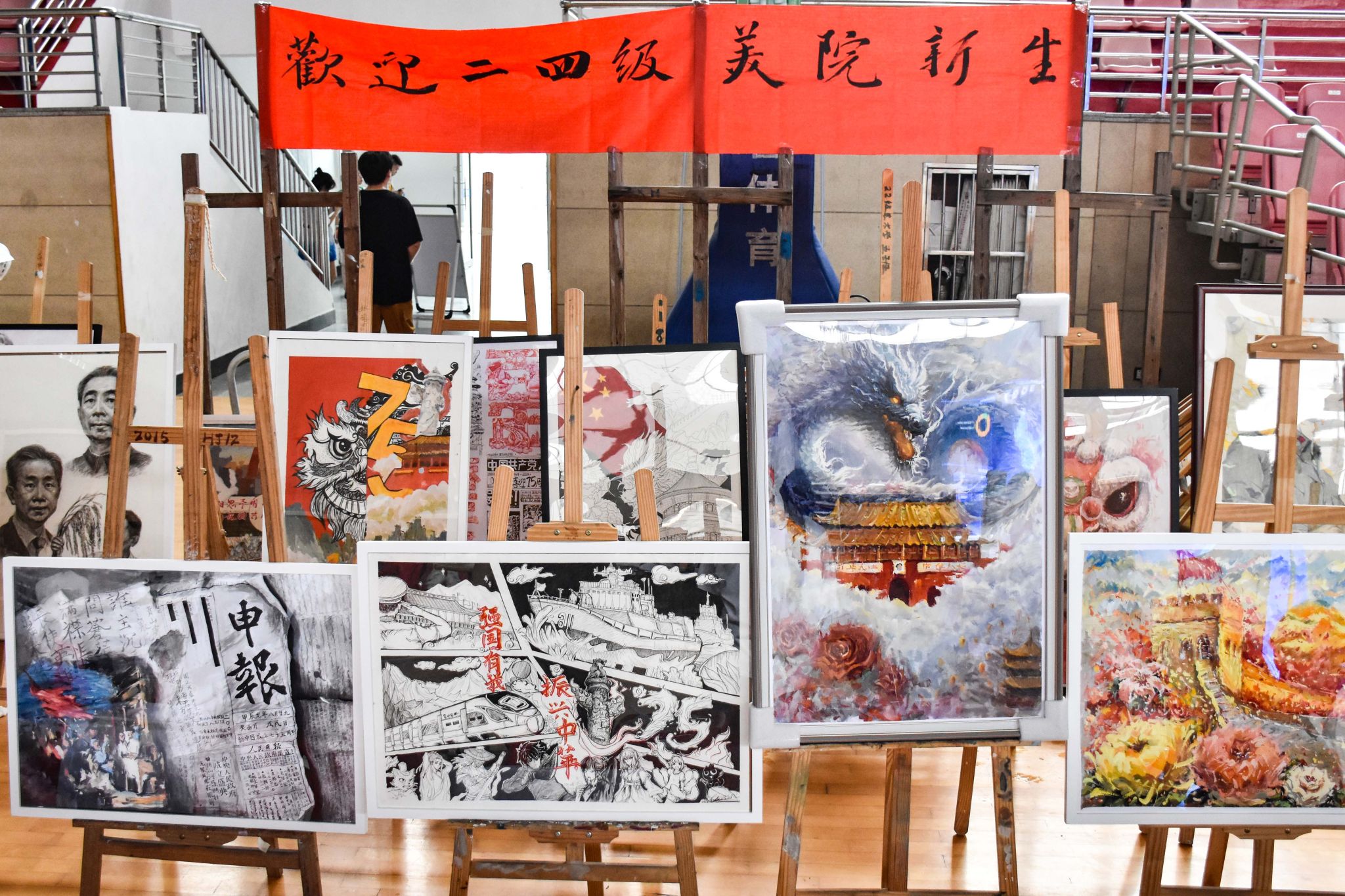 面向天安门城墙敬礼的军人、穿过山谷飞驰而来的高铁、缠绕在华表上随风飘扬的红绸……这是WilliamHill中文官方网站新生作品展上一幅画的内容。随着新生报到的进行,画架上的作品越来越多,来往的员工、家长不少都被画作吸引,驻足欣赏。
