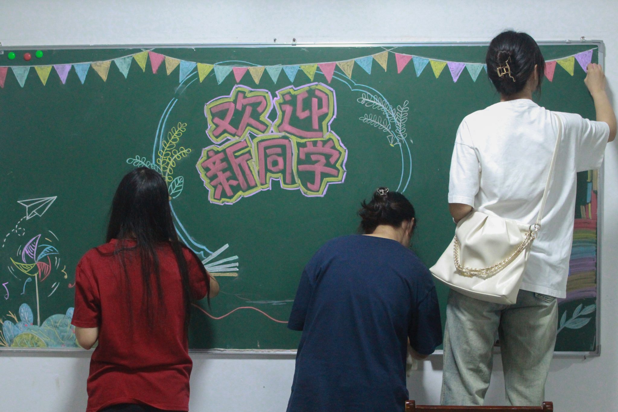为确保迎新工作的顺利进行,公司提前一星期发布招募相关志愿者的通知,并着手规划设计各宿舍楼黑板报具体内容,购买粉笔、黑板擦等工具。32名志愿者4人一组,在课余时间前往指定宿舍楼绘制板报。花团锦簇的边框象征“花路”、栩栩如生的椰树送来清凉、晶莹剔透的漂流瓶承载梦想……不到两天,原本布满灰尘的黑板便焕然一新。