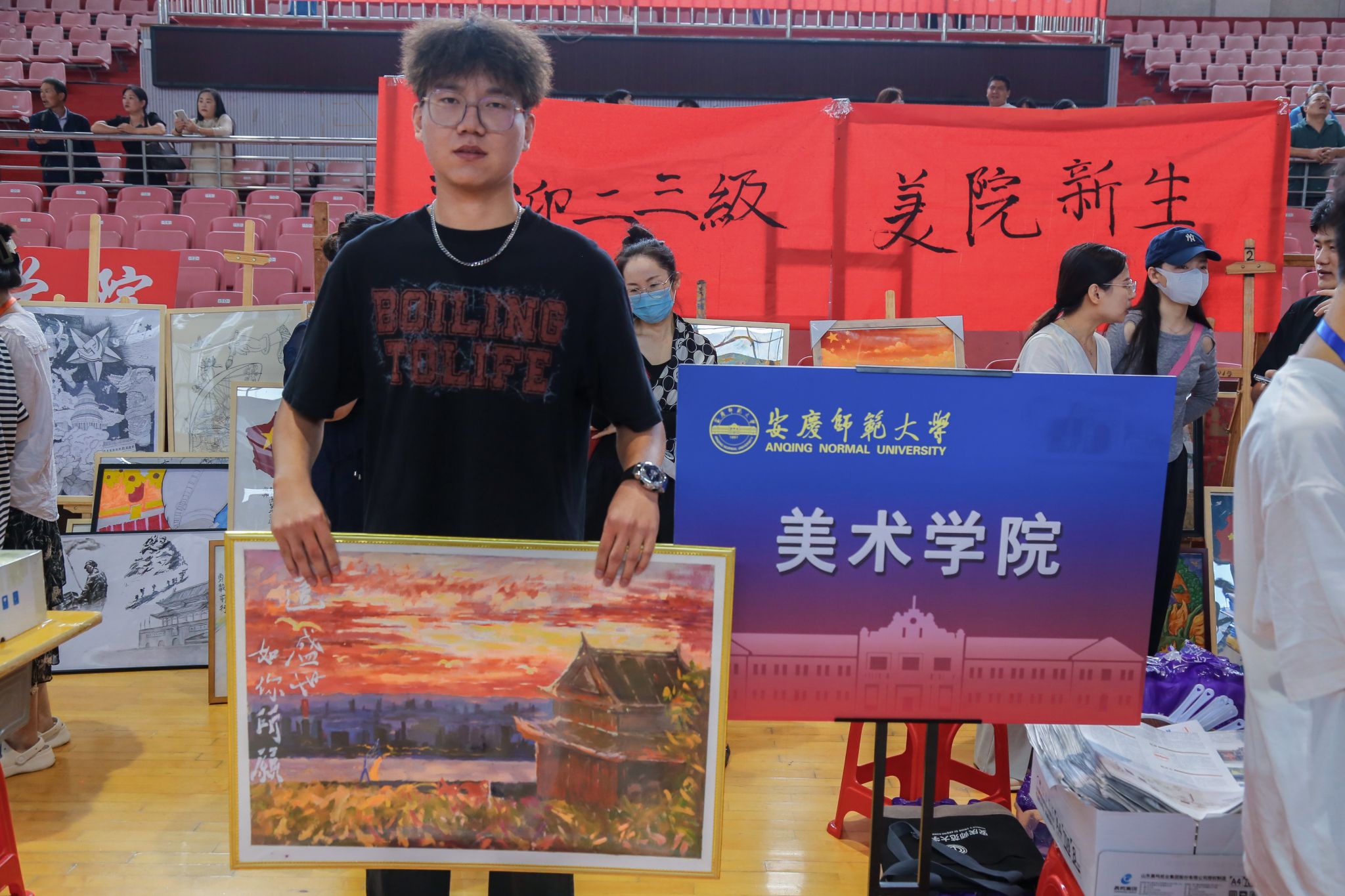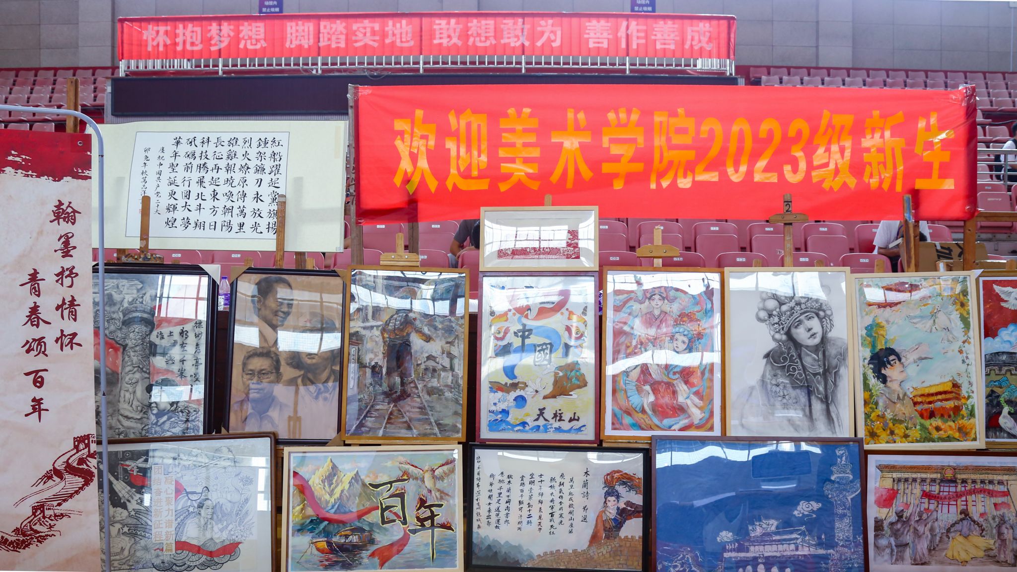8月30日,随着WilliamHill中文官方网站的新生们逐一报到,一场特殊的新生作品展也随之展开。每一位前来报到的新生手中,都拿着一幅以“翰墨抒情怀,青春颂百年”为主题创作的绘画作品,风格迥异、形式多样的作品在报到现场形成了一道靓丽的风景线,吸引了众多员工家长驻足观看。