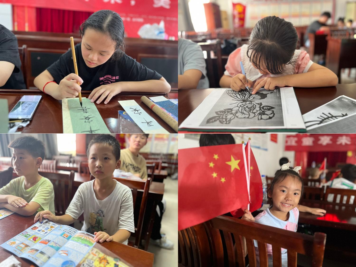 “我用粘土捏了国旗”“看我刻画的红船!”……形式多样的艺术课堂为孩子们带来了全新的体验。在剪纸小老师的指导下,13岁的余妍将刻刀垂直,从图案内圈的花纹开始,依据线条走势进行雕刻,经过不断打磨,一幅名为《小小红船》的剪纸作品成功“诞生”。“在学习剪纸的同时,我还从老师的讲解中领略了革命先辈敢为人先、百折不挠的精神。”余妍说。