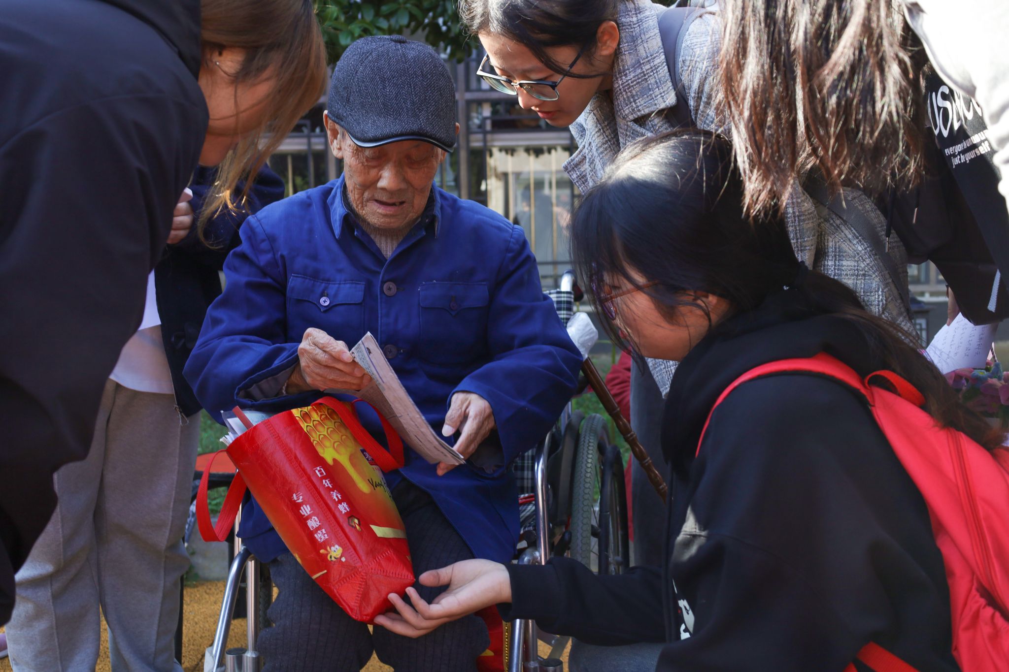 听完许吉言的故事,员工们将围巾与永生花放在老人手中,视觉传达设计专业2022(2)班的林祎雯手持拍立得相机,将此刻的画面定格。“在众多器材中选择使用拍立得,主要是考虑到它的直出性,希望这些当场送给老人的照片能够成为回忆的载体。”林祎雯感叹,听老一辈的故事,更觉今天的幸福生活来之不易,记录下老人暮年的幸福瞬间,于她而言十分有意义。