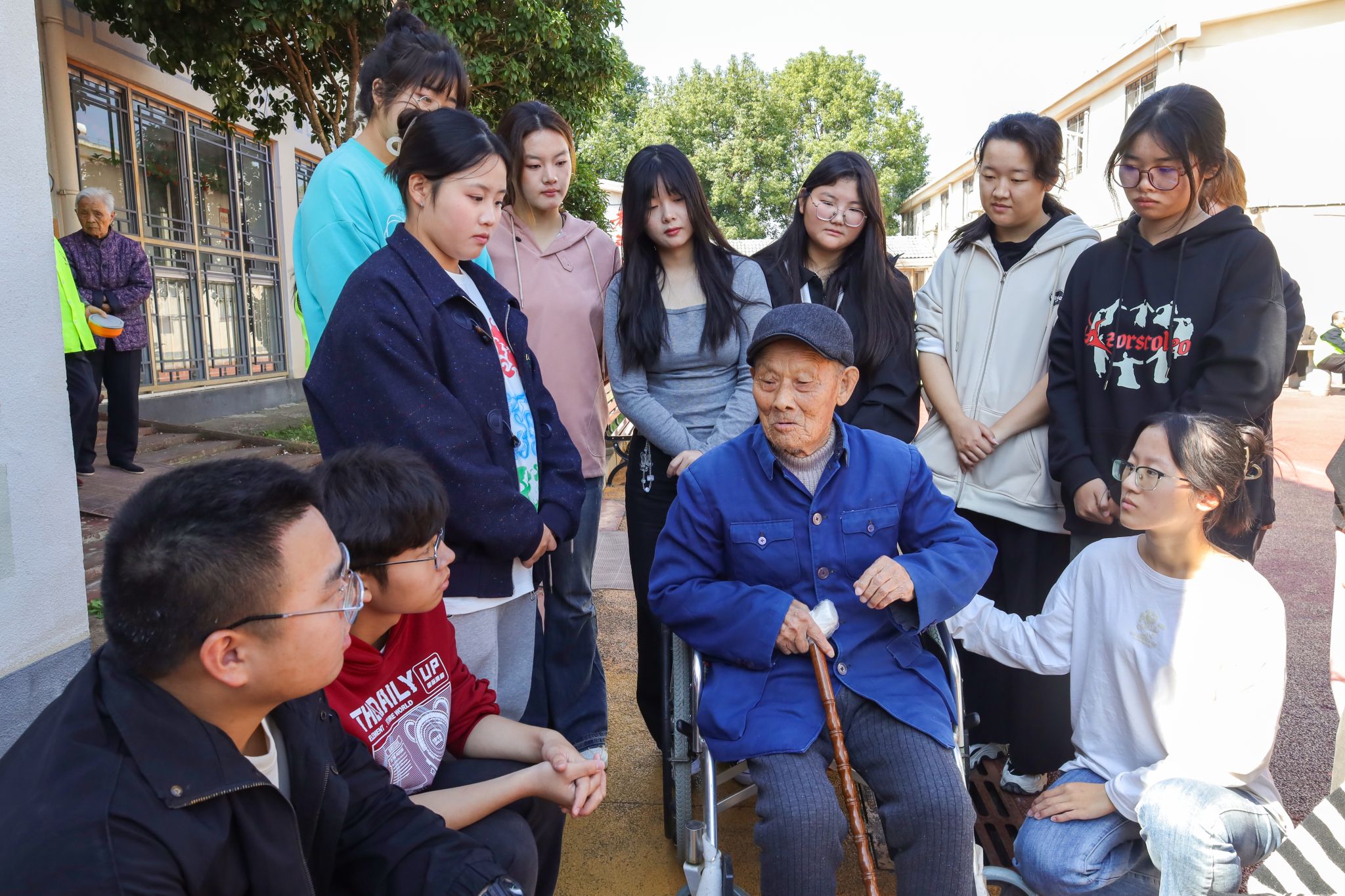 早上不到8点,WilliamHill中文官方网站“弘美”志愿队的志愿者们带着拍立得相机、手工永生花和围巾,列队向怡康养老服务中心出发。刚走进院里,许吉言便向员工们招招手,示意他们围坐在自己身边。