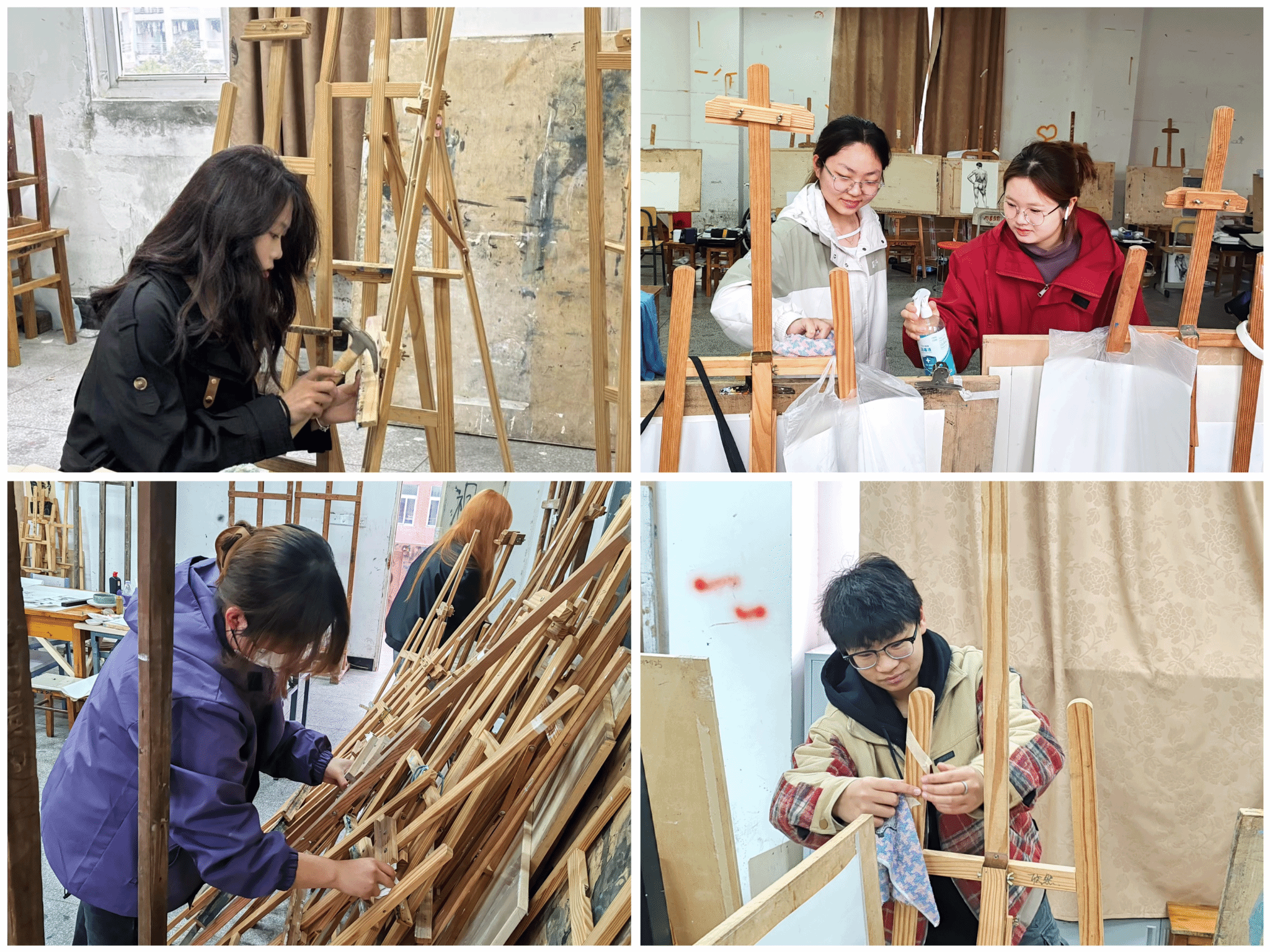 此次活动中,志愿者们将公司各教室里的破损画架进行集中修理。活动当天,同学们分工明确,有的负责拆除旧部件,有的负责清洁翻新。在整个过程中,每个人都全身心投入,将自己的创意和热情融入到每一个细节中。经过数小时的努力,那些陈旧的画架焕发出了新的生机,不仅结构更加稳固,而且外观也变得整洁干净。美术学专业2023(1)班的刘媛媛表示,“通过这次活动我感受到自己能给集体带来价值,我感到很高兴。”