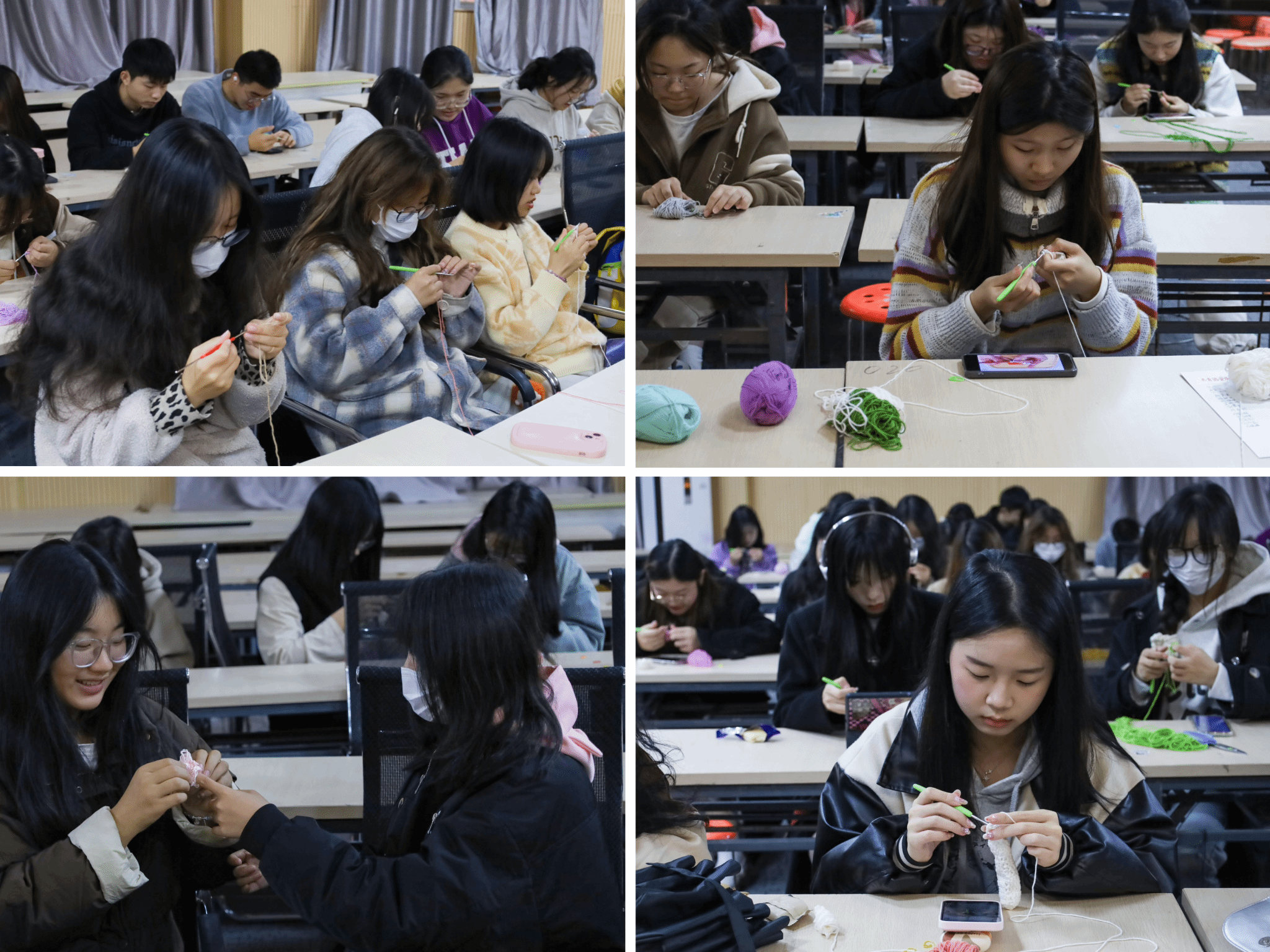 挑选双色毛线,钩针在毛线团快速穿插,一戳一绕间,一朵重瓣玫瑰便出现在海蓝色的门把手套上。“我平常课余时喜欢跟着视频教程制作各种手工制品,在院手工俱乐部里也学习过毛线的钩织技巧,所以制作起来得心应手。”美术学专业2023(2)班的王紫嫣是一名手工爱好者,在做完手中的门把手套后,她还化身“小老师”,帮助身边的同伴完成钩织起步与点缀的流程。