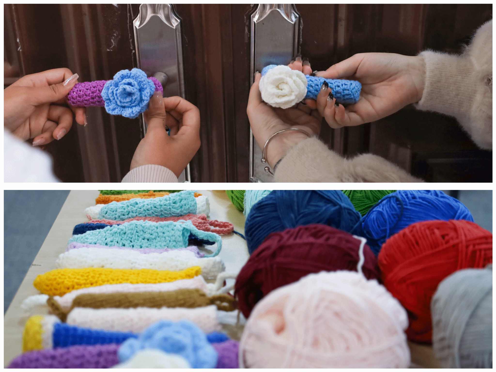 22团颜色各异的精梳棉毛线团和50余根软柄钩针是制作门把手“保暖外套”的全部材料,看似简易的制作材料在员工们手中却呈现出新花样。粉白交错的兔耳朵、花瓣层层重叠的玫瑰、海浪状的纹路……制作者“各显神通”,用多种元素点缀防寒门把手套,为教室门把手换上“新衣”。