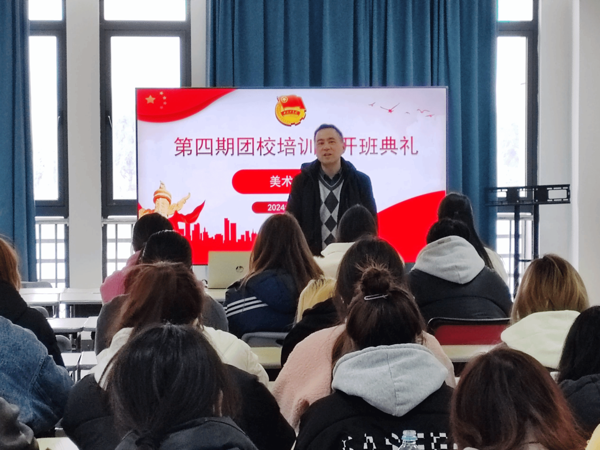 美术学专业2023(1)班谷雯静同学作为入团积极分子代表发言,国家奖学金获得者、视觉传达设计专业2021(1)班宋采菲同学作了个人成长成才分享报告,公司团委负责人详细介绍了团校培训期间的课程安排、实践活动和纪律要求,全体成员共同观看了《入团第一课》。