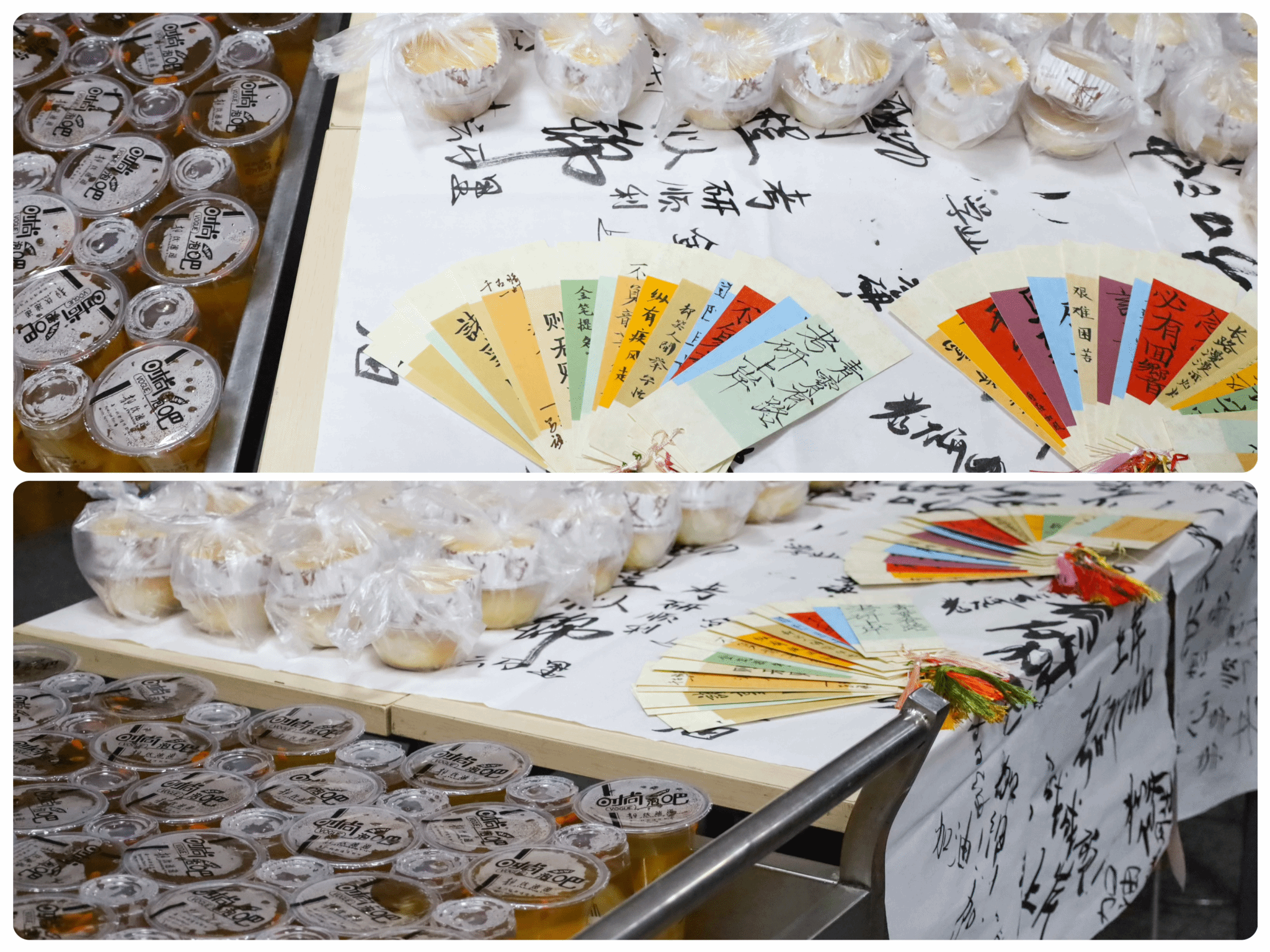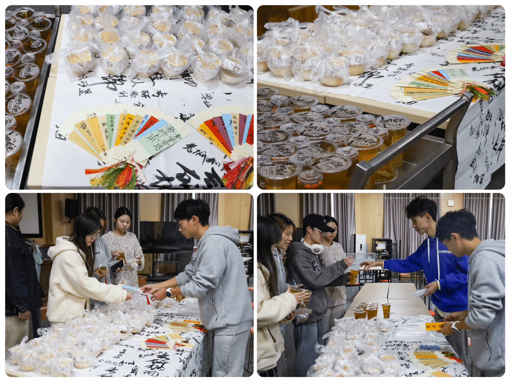 从购买材料到送出礼物,历时半个月,志愿者与公司书法俱乐部的成员共制作出20个折纸书签、40张书法明信片、60杯银耳雪梨羹以及120份烘培面包。“考虑到天气比较干燥,而银耳雪梨羹有滋阴生津、润肺止咳的功效,我们便将它与刚出炉的面包搭配在一起,可以让学长学姐在紧张备考的氛围中缓解一些压力,增强体质。”活动负责人之一、美术学专业2022(1)班的张乐添说。