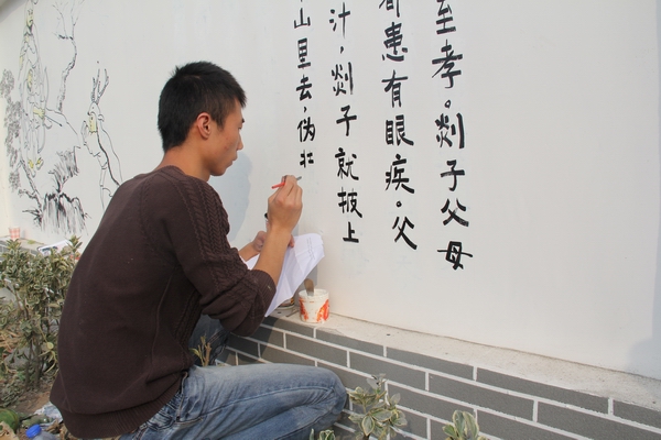 刘青是该工作室的一名党员骨干,是公司2010级美术学专业的员工。他告诉我们,他一直热爱绘画,尤其是墙绘,在大学这近四年的时间里,他利用课余时间潜心钻研,希望通过墙绘的方式去传播美德、传播文明。王凯旋是公司2011级动画专业员工,是墙体彩绘工作室的业务骨干。他告诉我们自己做墙绘已经很长时间,原来是一个人一边学一边做,感觉做很累,而且效果不是特别理想。后来,几个有同样兴趣的同学凑在一起,在一起交流切磋,并对外承接一点业务,来解决一点自己的生活费。我们希望会有更多感兴趣的同学加入这个团队,一起交流学习,一起提升专业技能。